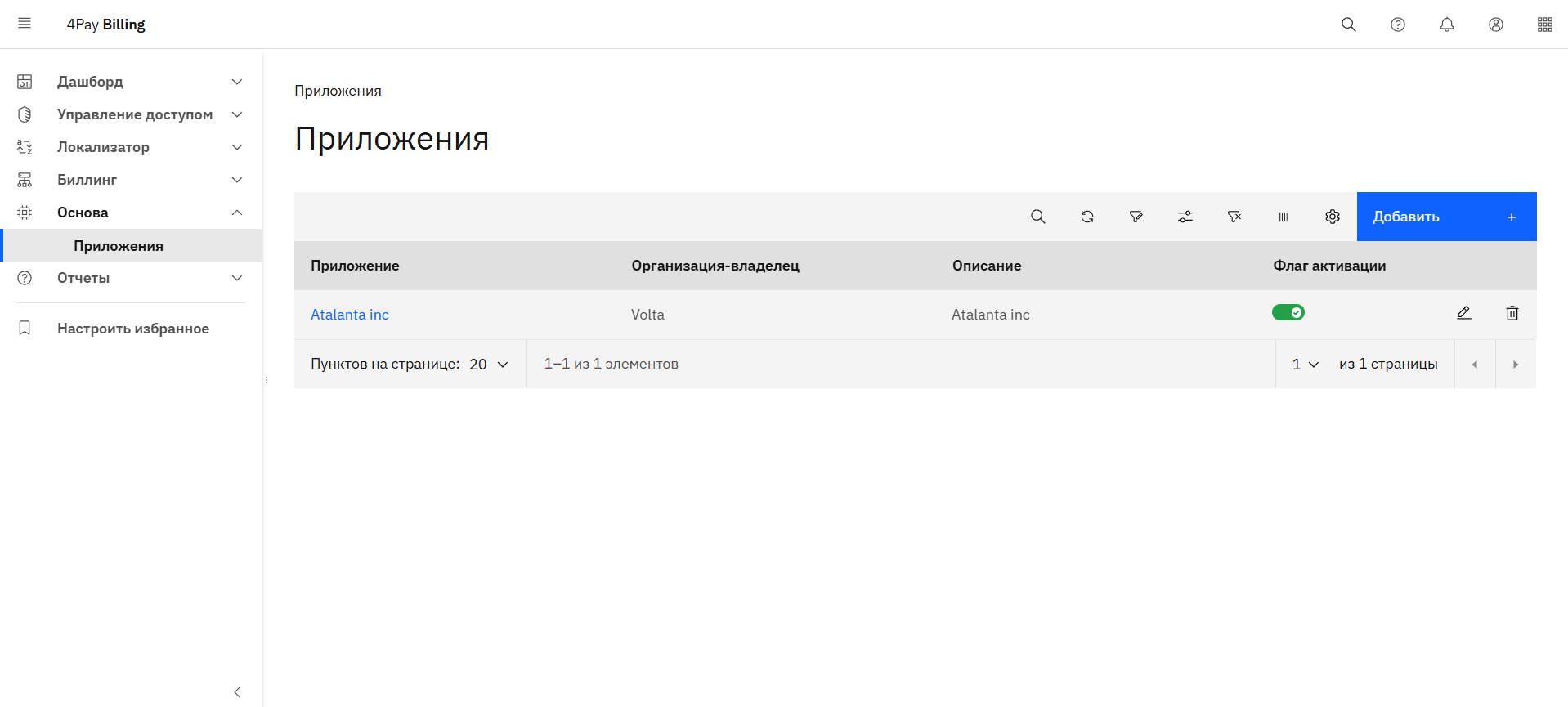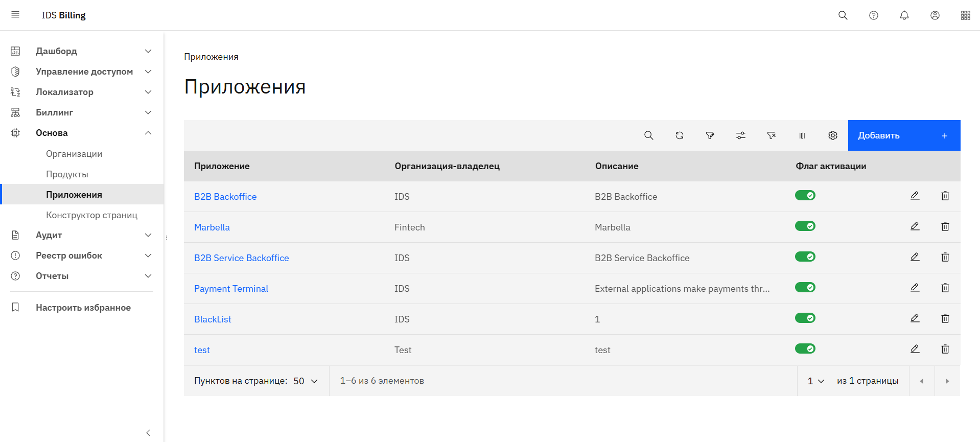 Здесь отображаются все Приложения, к которым открыт доступ у пользователя и его организации. Также есть возможность их создания, удаления и редактирования. У всех приложений отображаются: название, организация-владелец, описание.