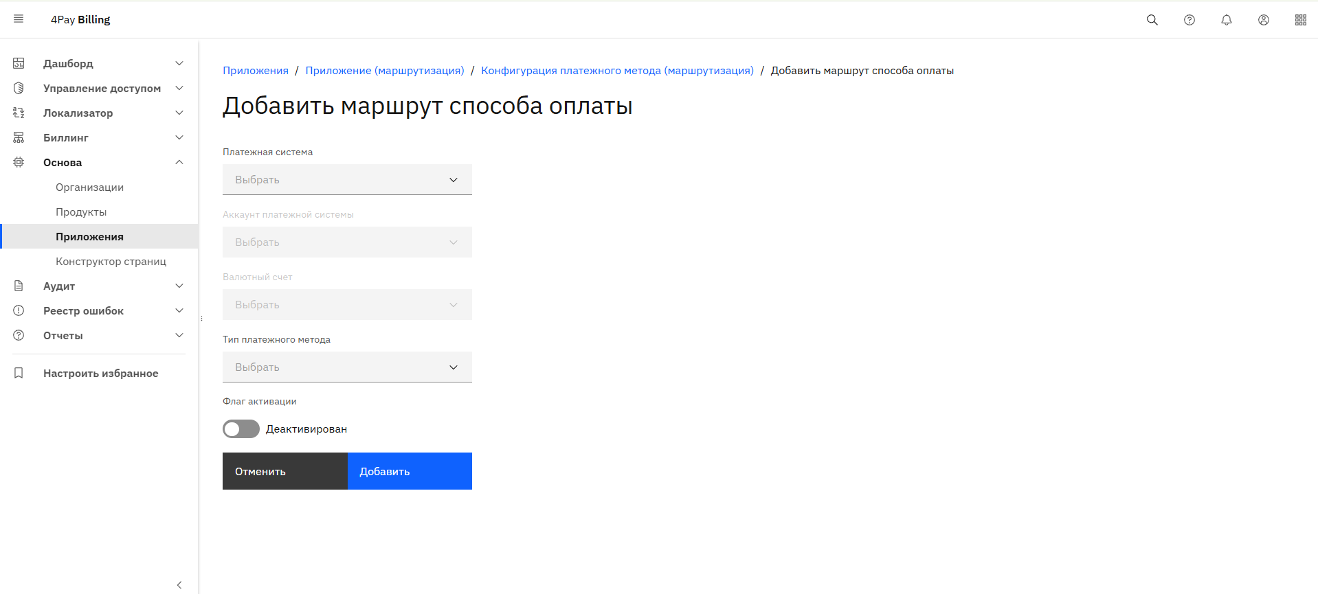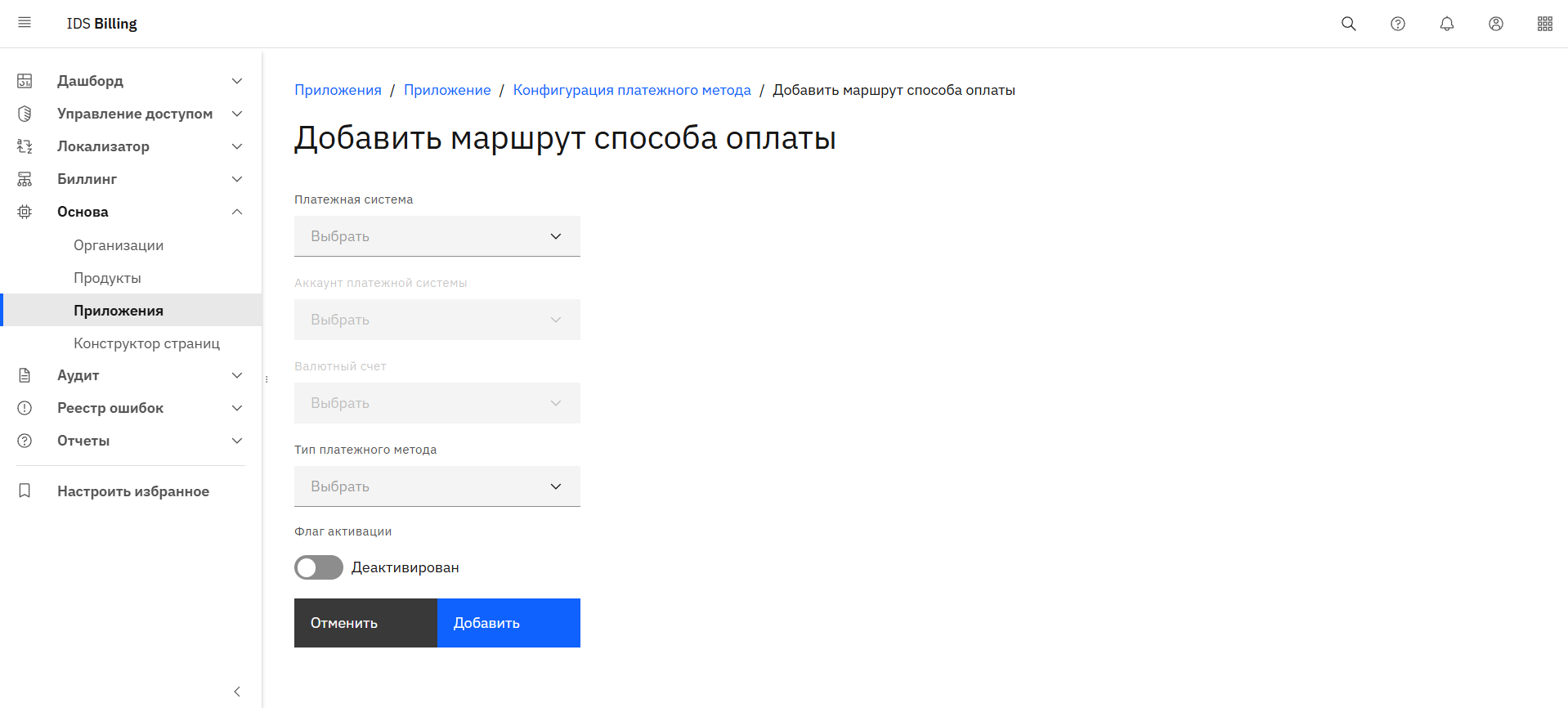 При создании нового маршрута способа оплаты можно выбрать из тех вариантов, которые доступны и активированы для Организации-владельца приложения.