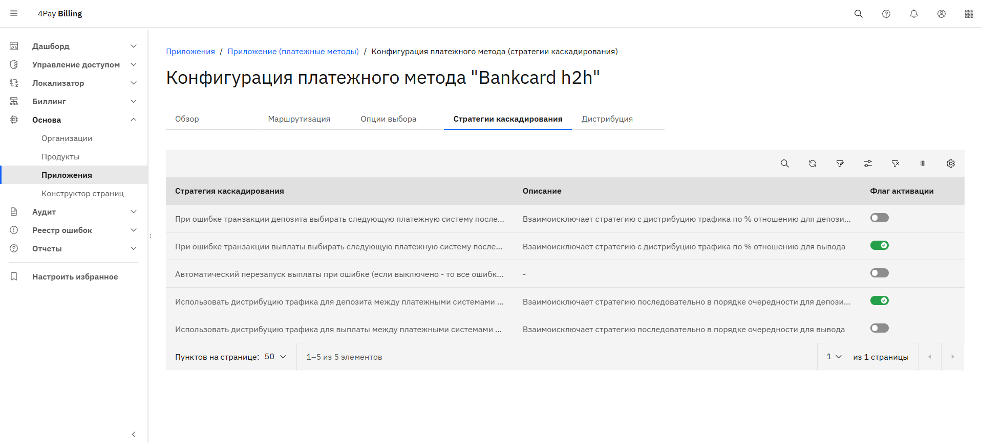 Во вкладке Стратегии каскадирования в конфигурации платежного метода выбрать нужную стратегию каскадирования с помощью активации/деактивации флагов. Если платежный маршрут не отработает, то какой брать следующим (в порядке очередности или по процентному соотношению). Обратите внимание на описание стратегий, часть из них являются взаимоисключающими. Здесь вы либо ставите приоритет платежных систем по их очередности, либо по процентам. Оба этих параметра настраиваются во вкладке дистрибуция.