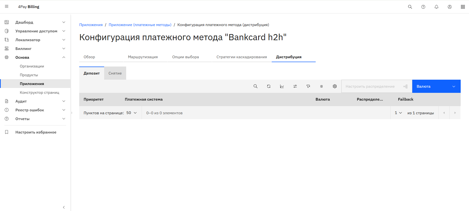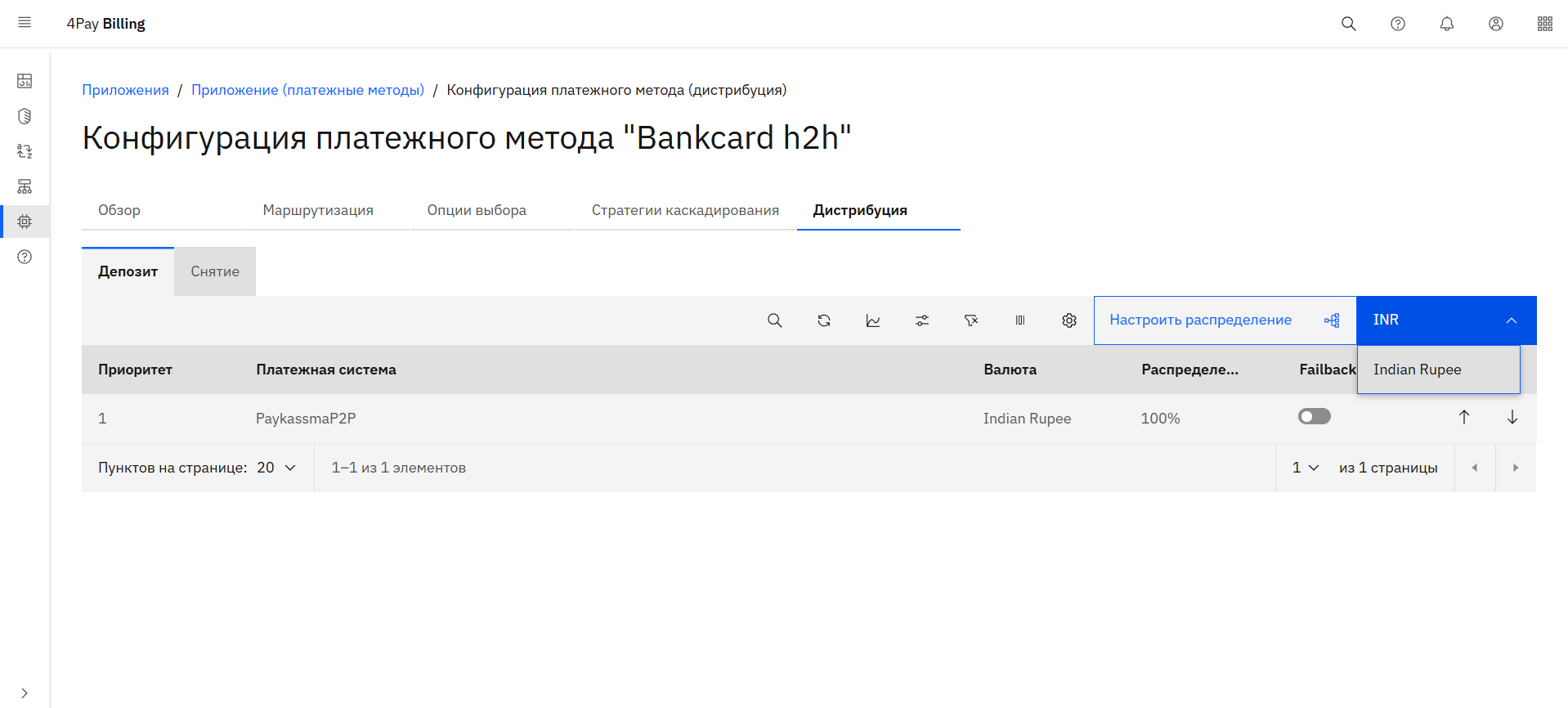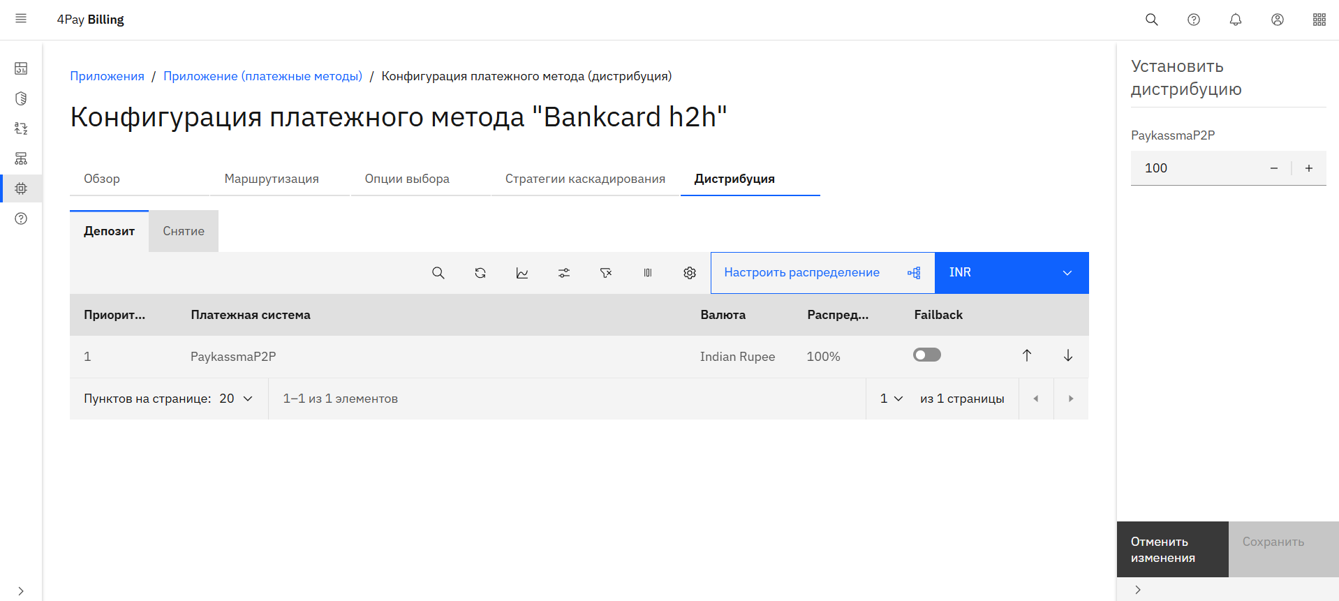 Для этого нужно в выбранном платежном методе перейти на вкладку Дистрибуция. Обратите внимание, дистрибуцию можно отдельно настроить для депозита и снятия.