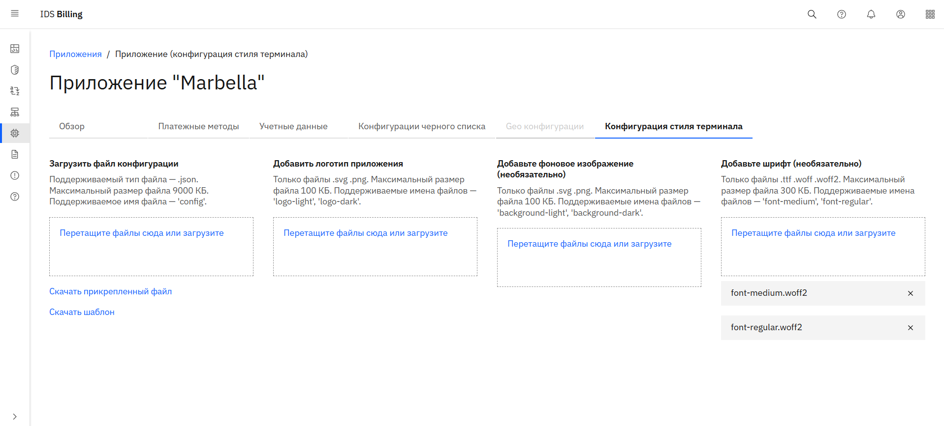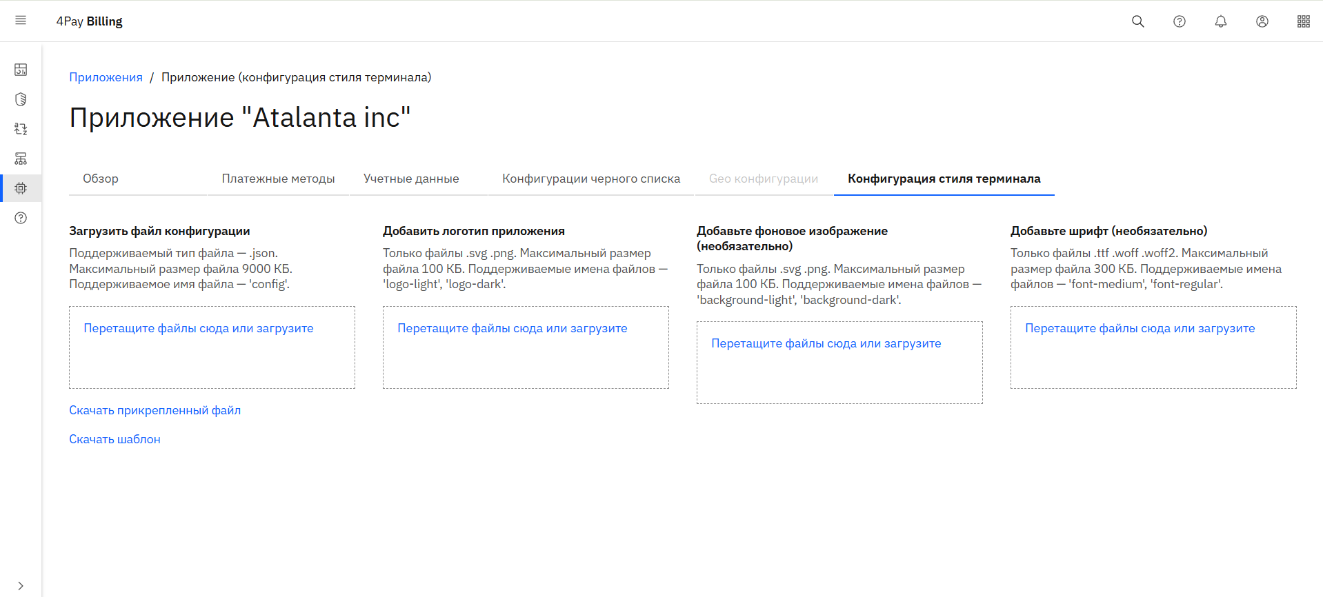 Во вкладке Конфигурация стиля терминала можно скачать шаблон конфигурации и прикрепленные файлы. А также можно добавить свой файл конфигурации, логотип, фоновое изображение и шрифт для терминала. Подробнее о настройке терминала здесь.