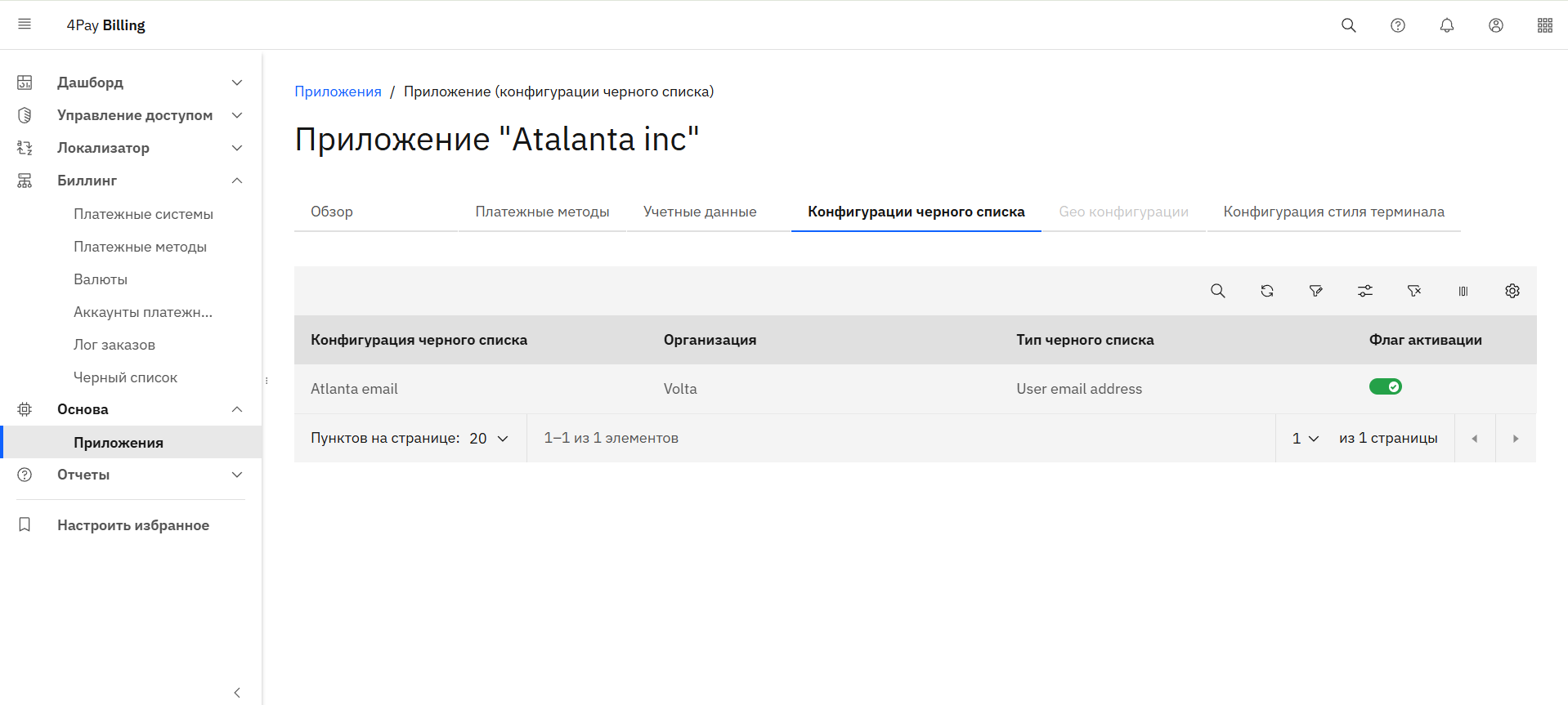 После этого нужно перейти в продукт Основа, выбрать Приложения, во вкладке Конфигурации черного списка активировать созданный черный список.