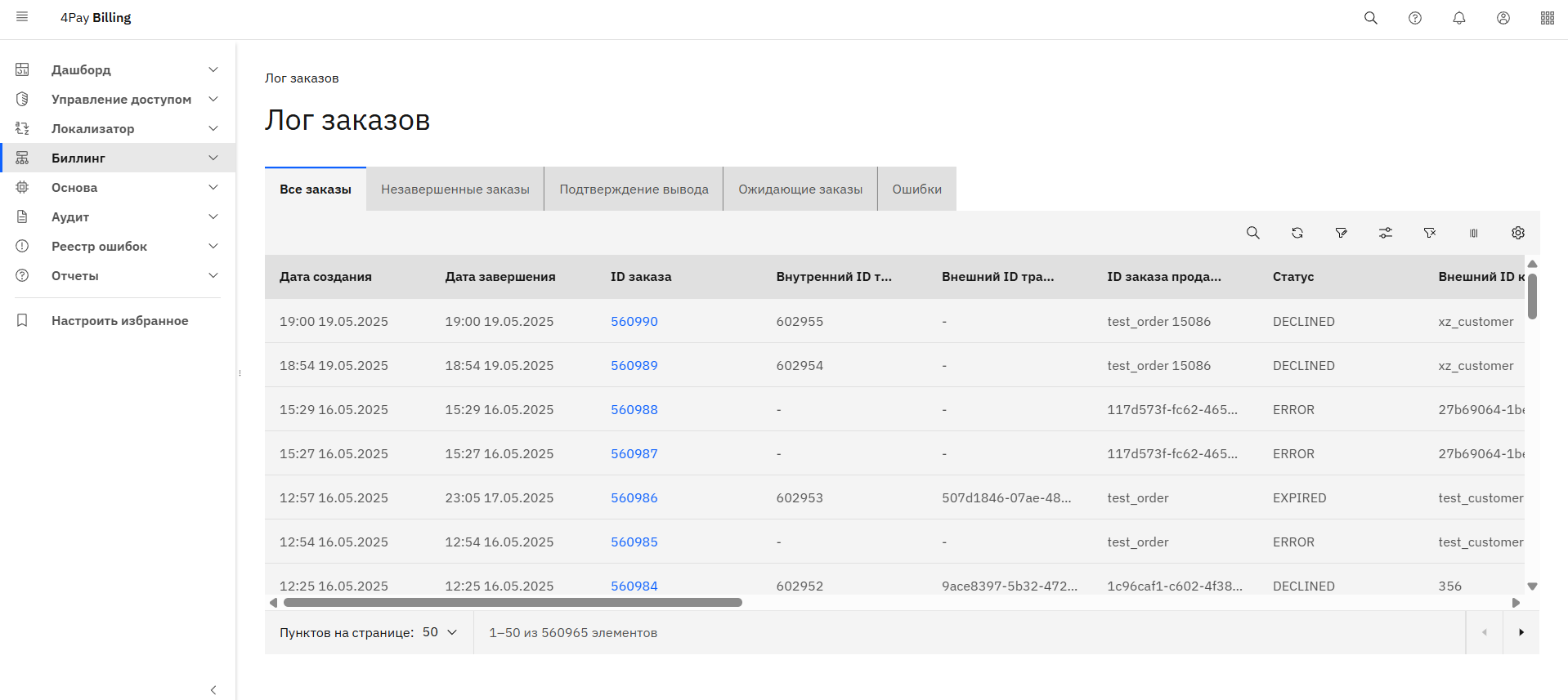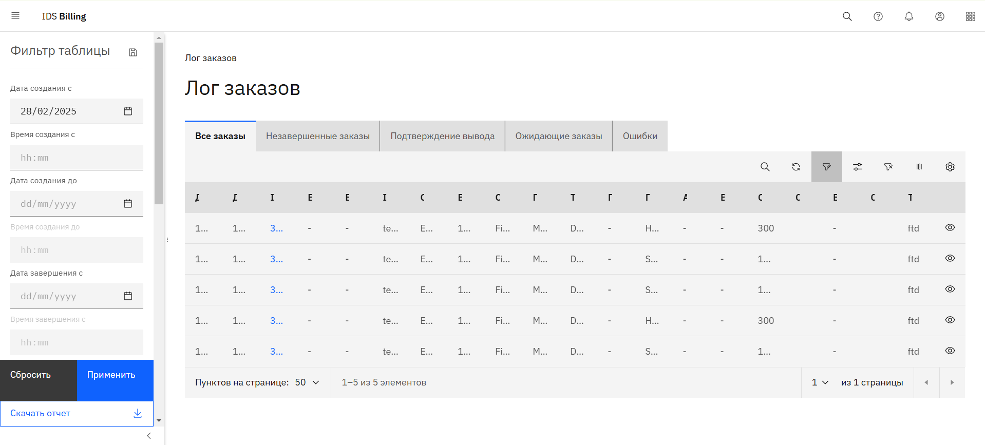 Здесь отображаются все транзакции, которые зафиксировала система, и к которым есть доступ у пользователя. Сверху можно выбрать отображение всех заказов, незавершенных заказов, ожидающих подтверждения вывода, ожидающих заказов, заказов, завершившихся ошибкой.