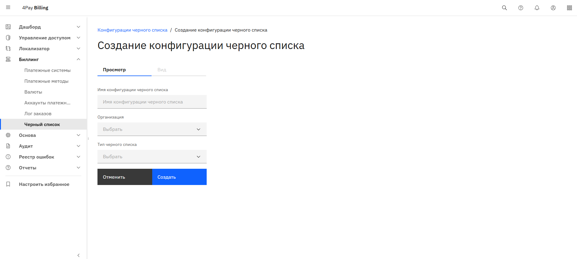 При создании нового черного списка во вкладке Обзор необходимо выбрать тип черного списка (номера карт, BIN, email адреса и т.д.).