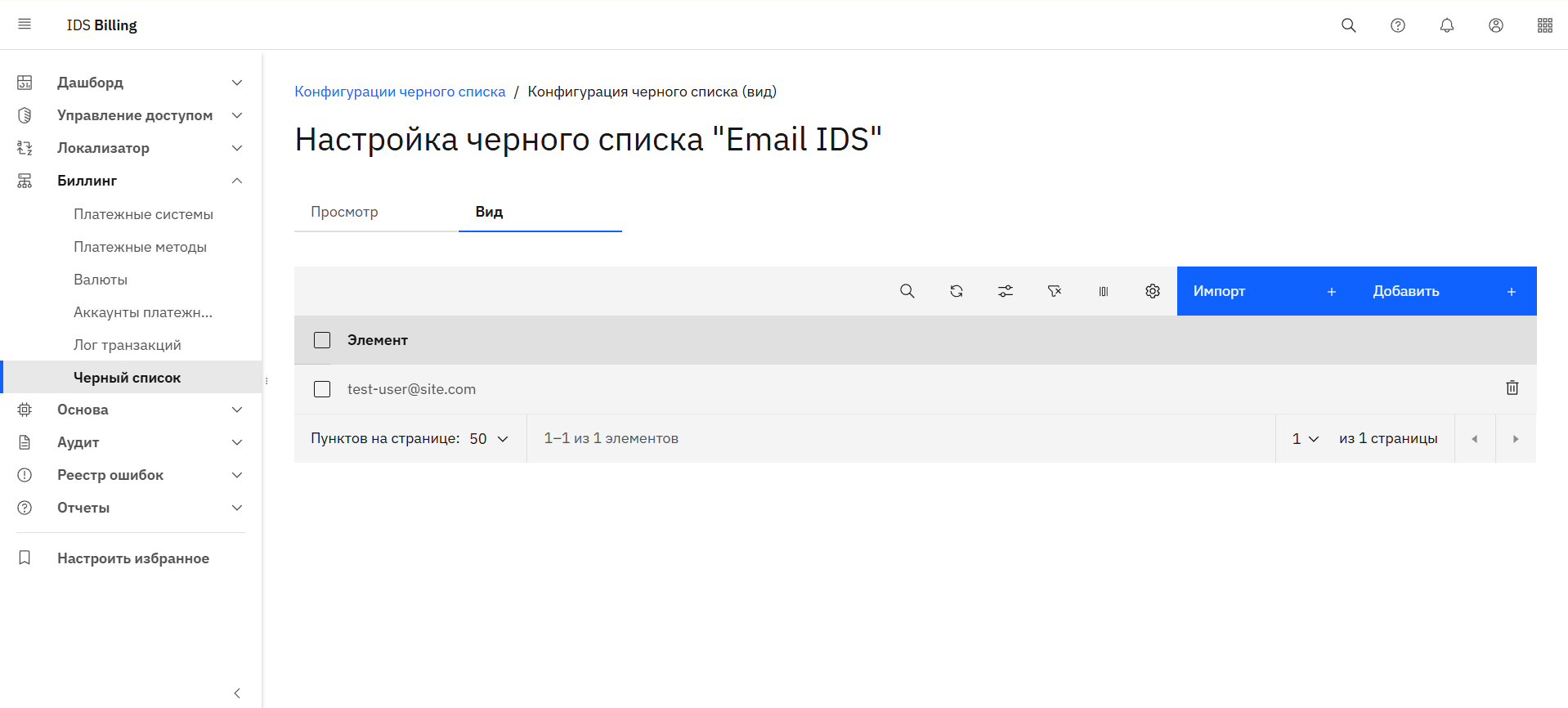 Во вкладке Вид отображаются все пункты (элементы) черного списка. Любой пункт можно удалить нажав на иконку корзины в правой части таблицы. Также есть возможность добавить один новый пункт кнопкой “Добавить” или импортировать готовый список элементов кнопкой “Импорт”.