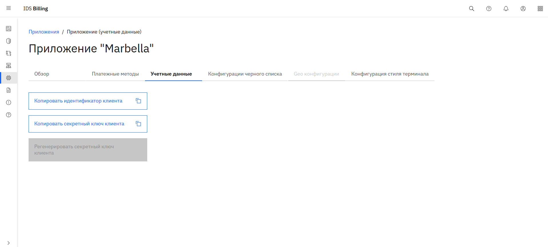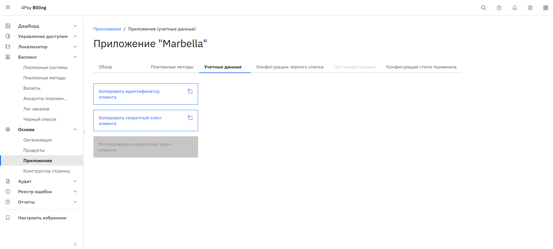 Во вкладке Учетные данные можно скопировать идентификатор и секретный ключ клиента для конкретного приложения. Это необходимо для подключения через api/sdk. Подробная инструкция о генерации подписи.