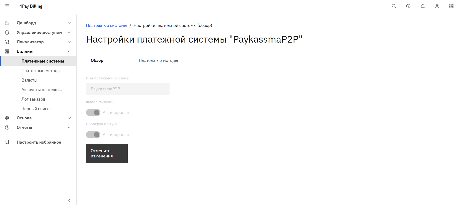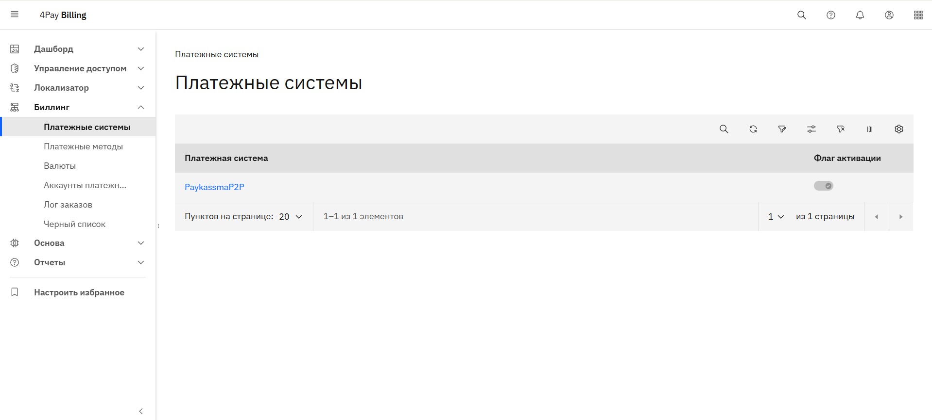 Здесь отображаются все платежные системы, доступные пользователю. Активировать/деактивировать их может только администратор платформы.