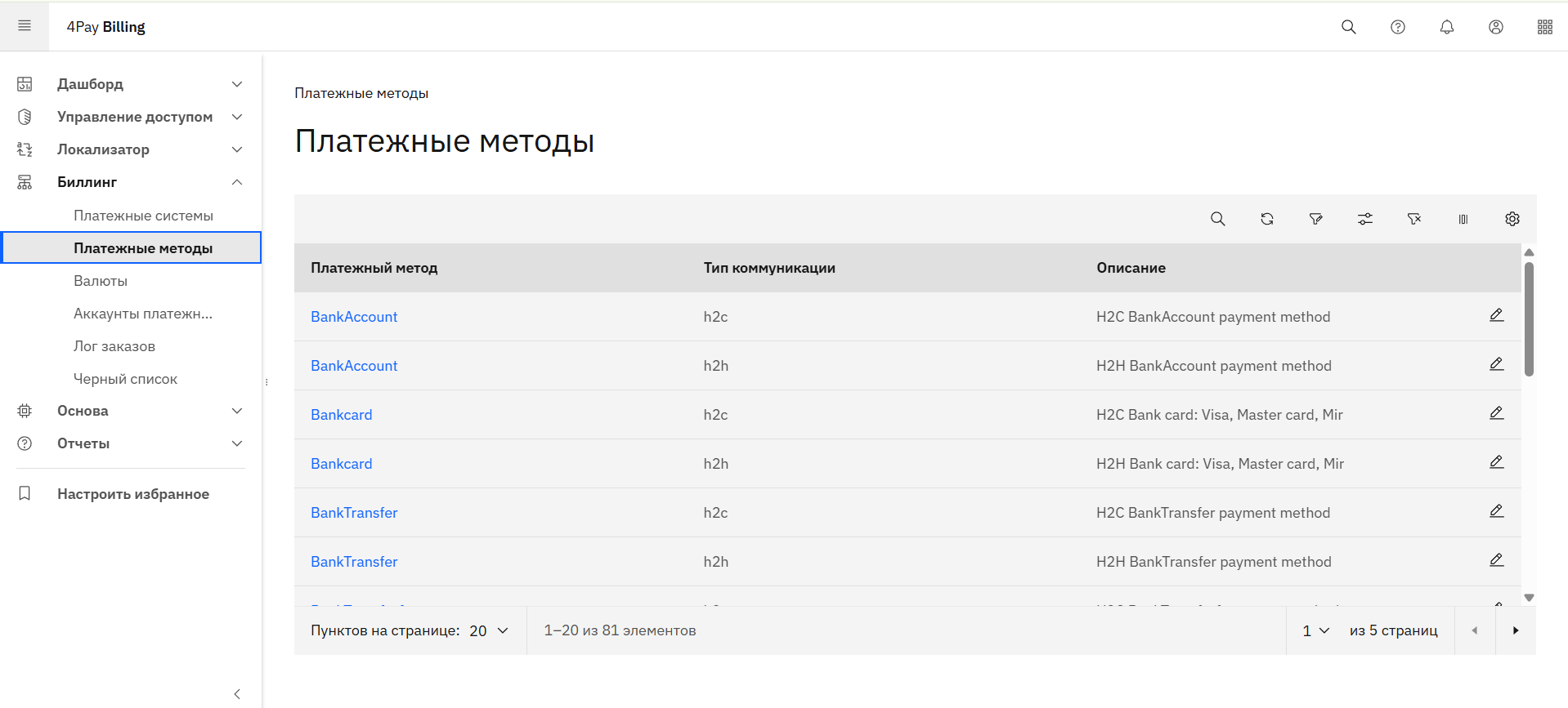 Здесь отображаются все платежные методы, их тип коммуникации и описание, доступные пользователю.