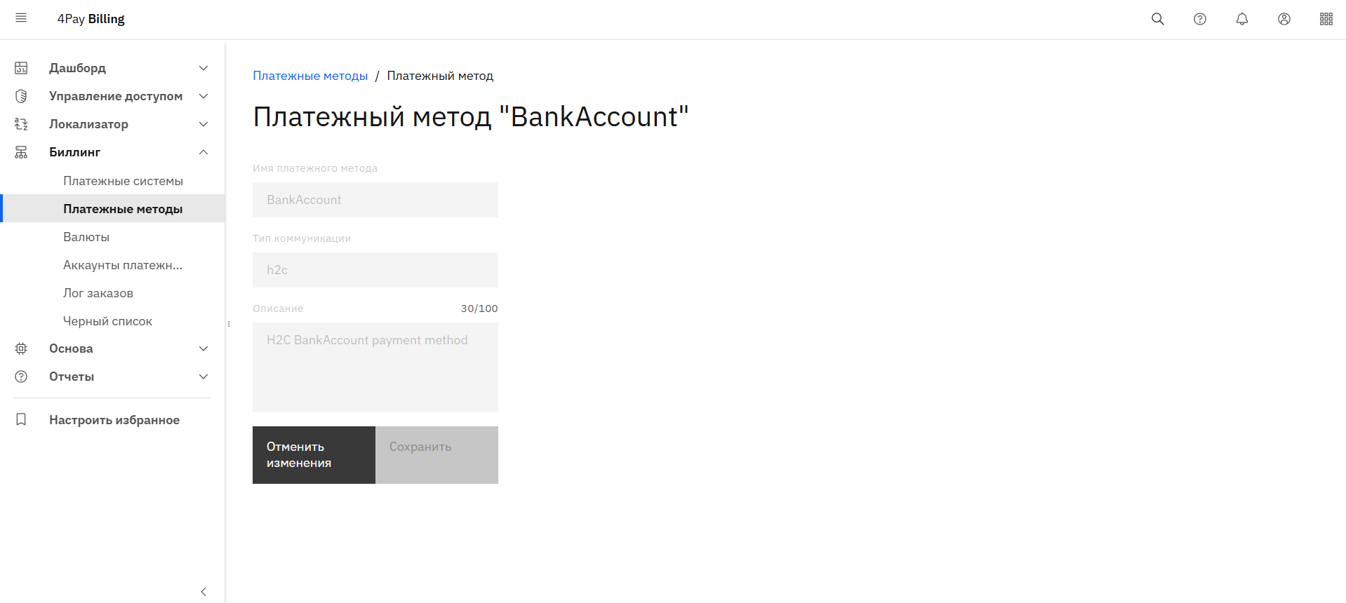 По клику на название платежного метода можно перейти к подробной информации. Здесь можно просмотреть имя, тип коммуникации и описание платежного метода. Редактирование недоступно.