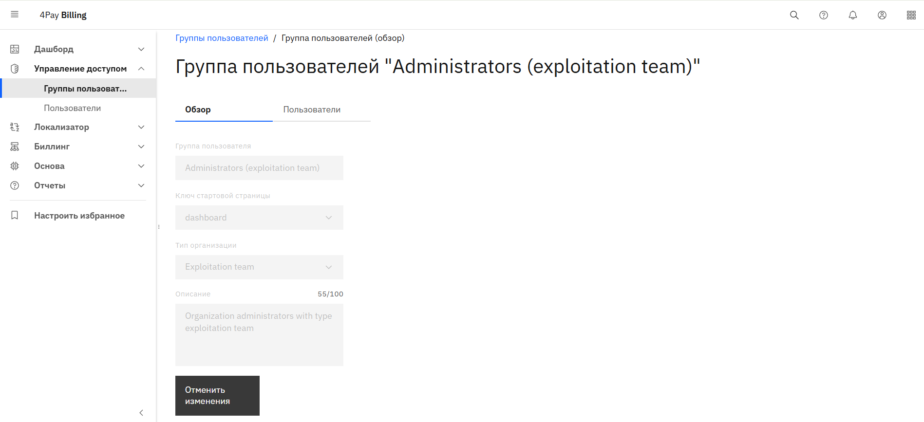 В разделе редактирования доступны 2 вкладки: “Обзор”, “Пользователи”. Во вкладке Обзор можно посмотреть имя и описание группы, ключ стартовой страницы (на какой странице будет открываться Billing для этой группы пользователей), тип организации (платформа, вендор, команда эксплуатации).