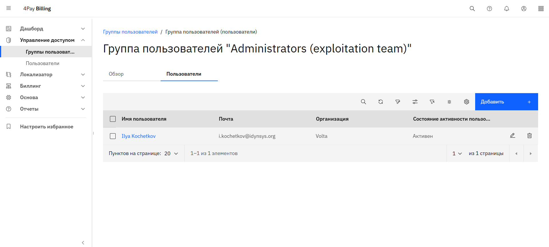 Во вкладке Пользователи отображаются все работники организации, добавленные в группу и имеющие одинаковые права доступа. Также здесь есть возможность добавлять или удалять пользователей из группы. Например, пользователь добавлен в группу администраторы команды эксплуатации. В данной группе есть роли, которые позволяют видеть и редактировать страницы продукта Биллинг. Значит пользователь сможет видеть и редактировать их.