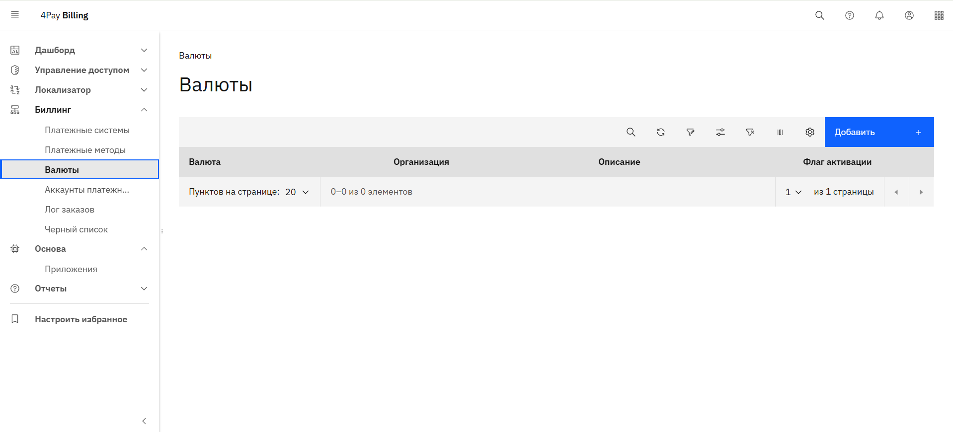 Для этого нужно перейти в продукт Биллинг, подраздел Валюты и нажать “Добавить”.