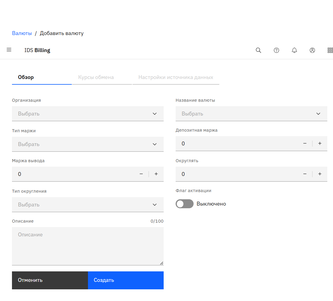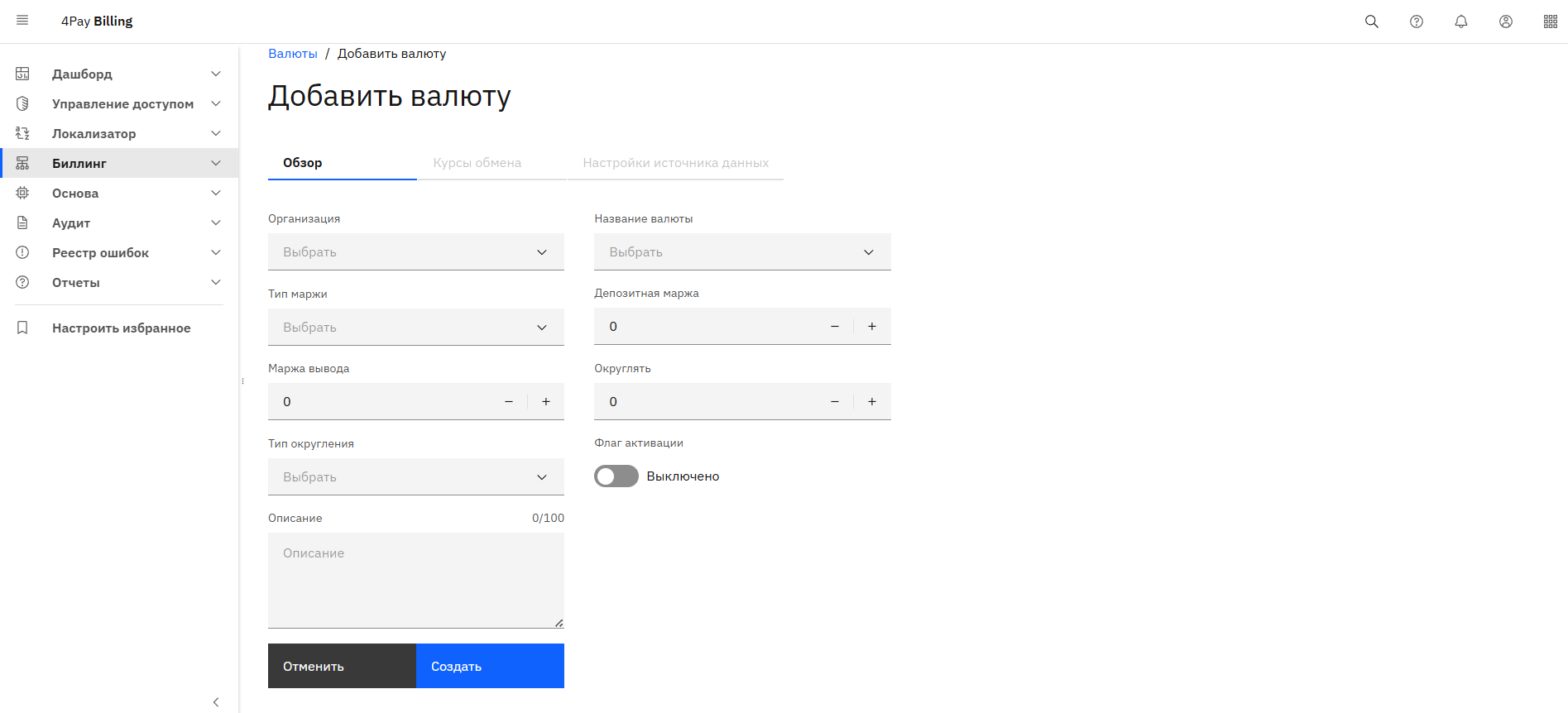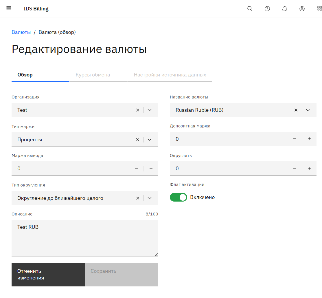 В разделе редактирования 3 вкладки: “Обзор”, “Курсы обмена”, “Настройка источника данных”. Во вкладке Обзор можно установить организацию-владельца валюты, тип маржи (проценты или фикс), тип округления, название валюты, ее описание, маржу вывода, депозитную маржу, округление.