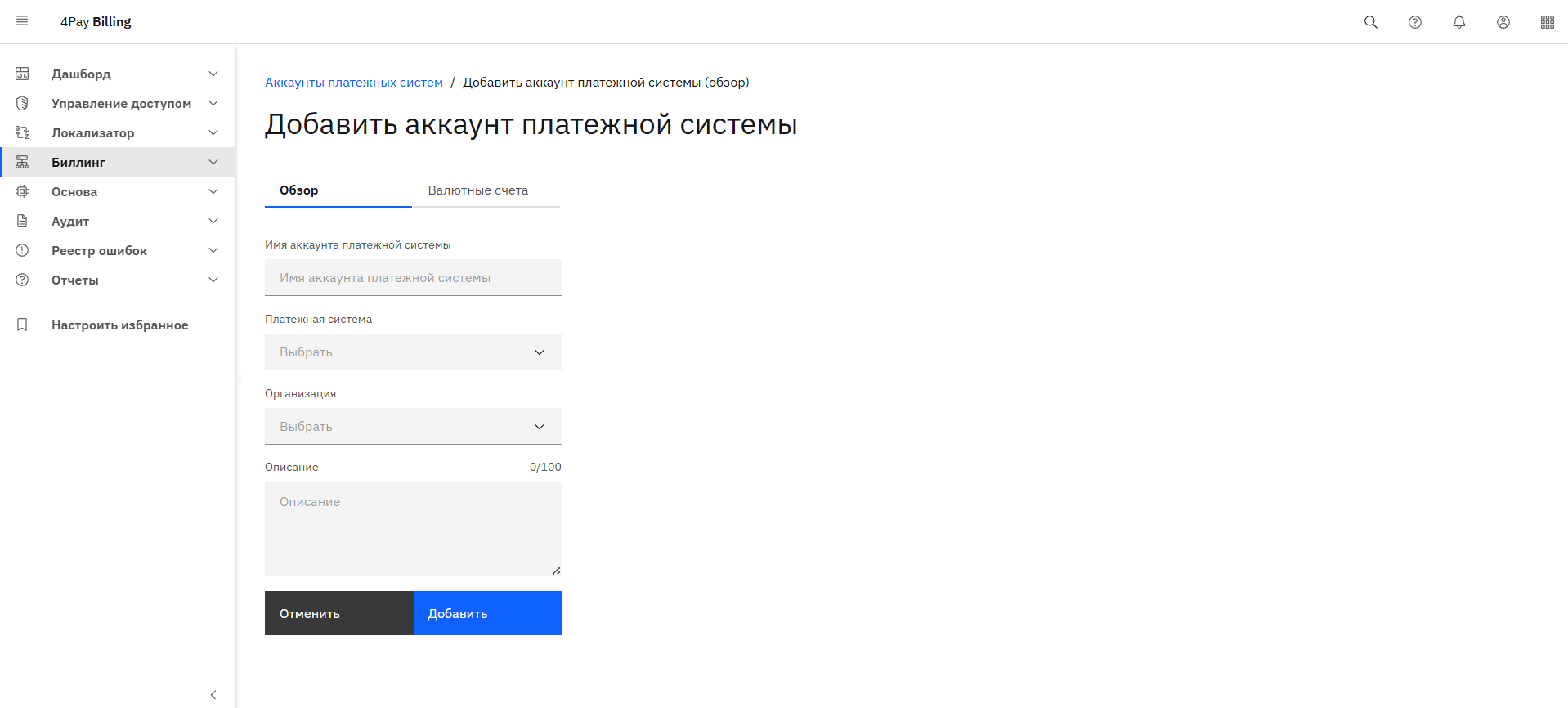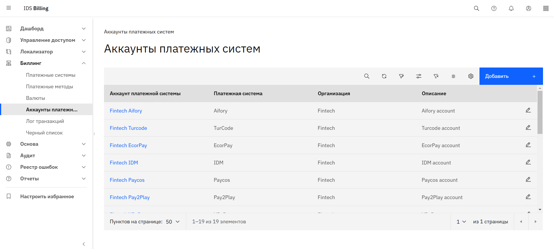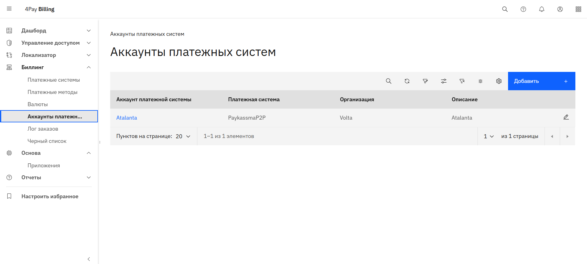 Аккаунт платежных систем — это договор организации с платежной системой. Здесь отображаются все аккаунты платежных систем для организации пользователя. Также есть возможность их создания и редактирования. За каждой организацией закреплен Аккаунт платежной системы, к которому прикреплены валютные счета компании.