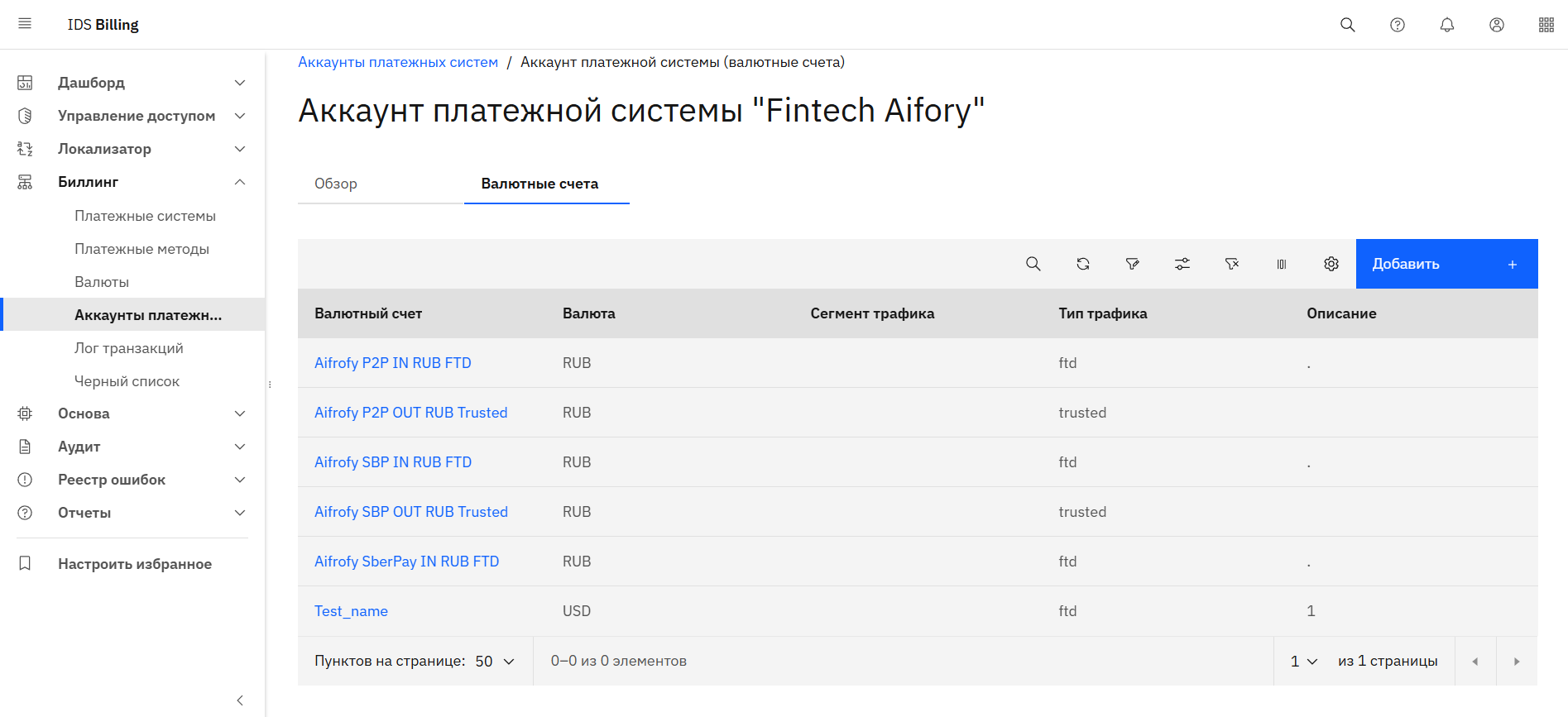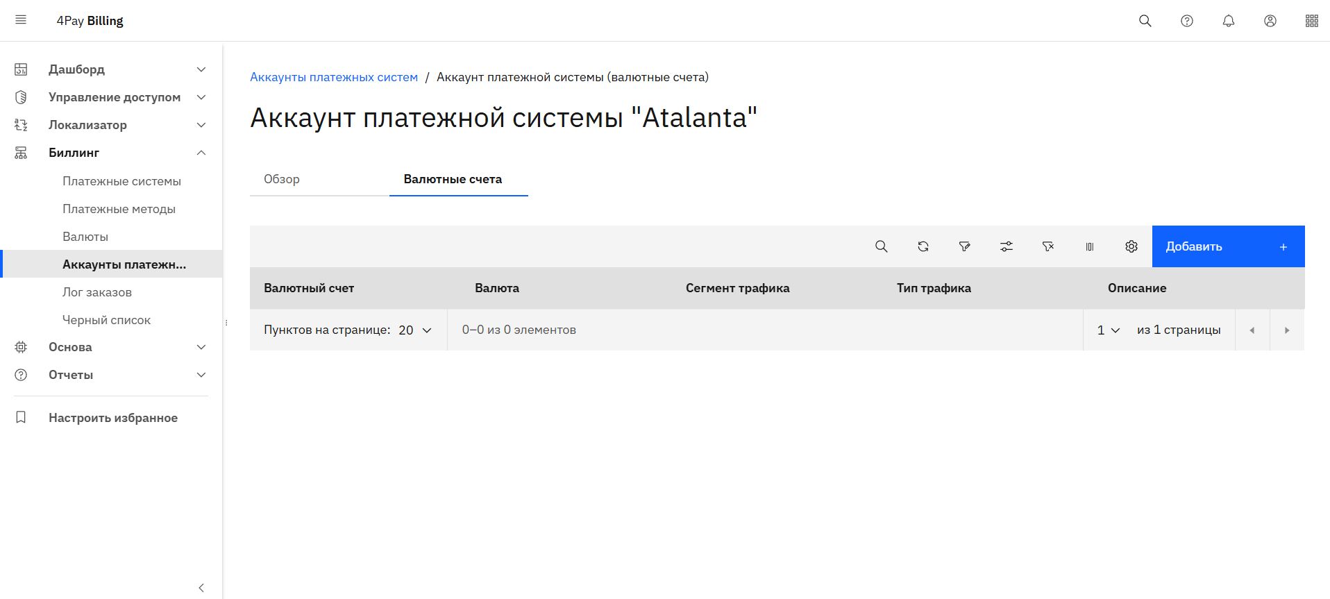 Во вкладке Валютные счета отражается название и описание счета, код валюты, сегмент трафика, тип трафика (ftd или trusted).