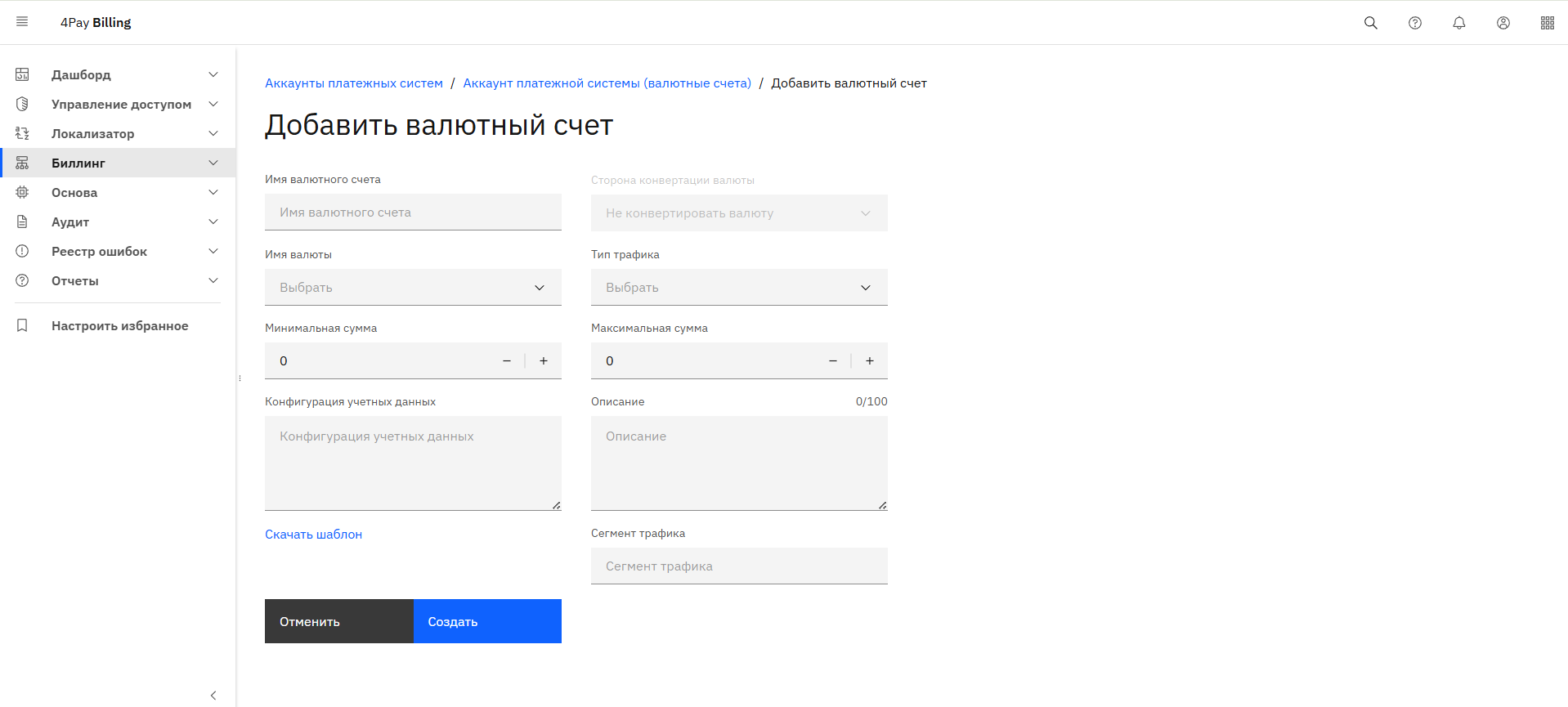 В разделе редактирования валютного счета можно изменить имя и описание валютного счета, имя валюты, тип и сегмент трафика. Также здесь можно установить минимальную и максимальную сумму платежа, вписать конфигурации учетных данных.