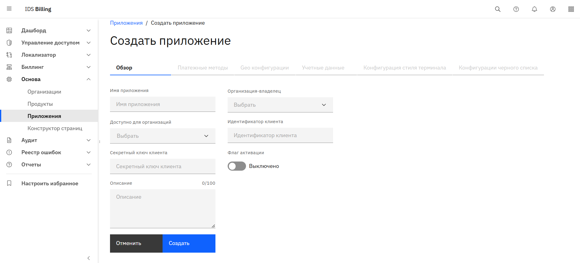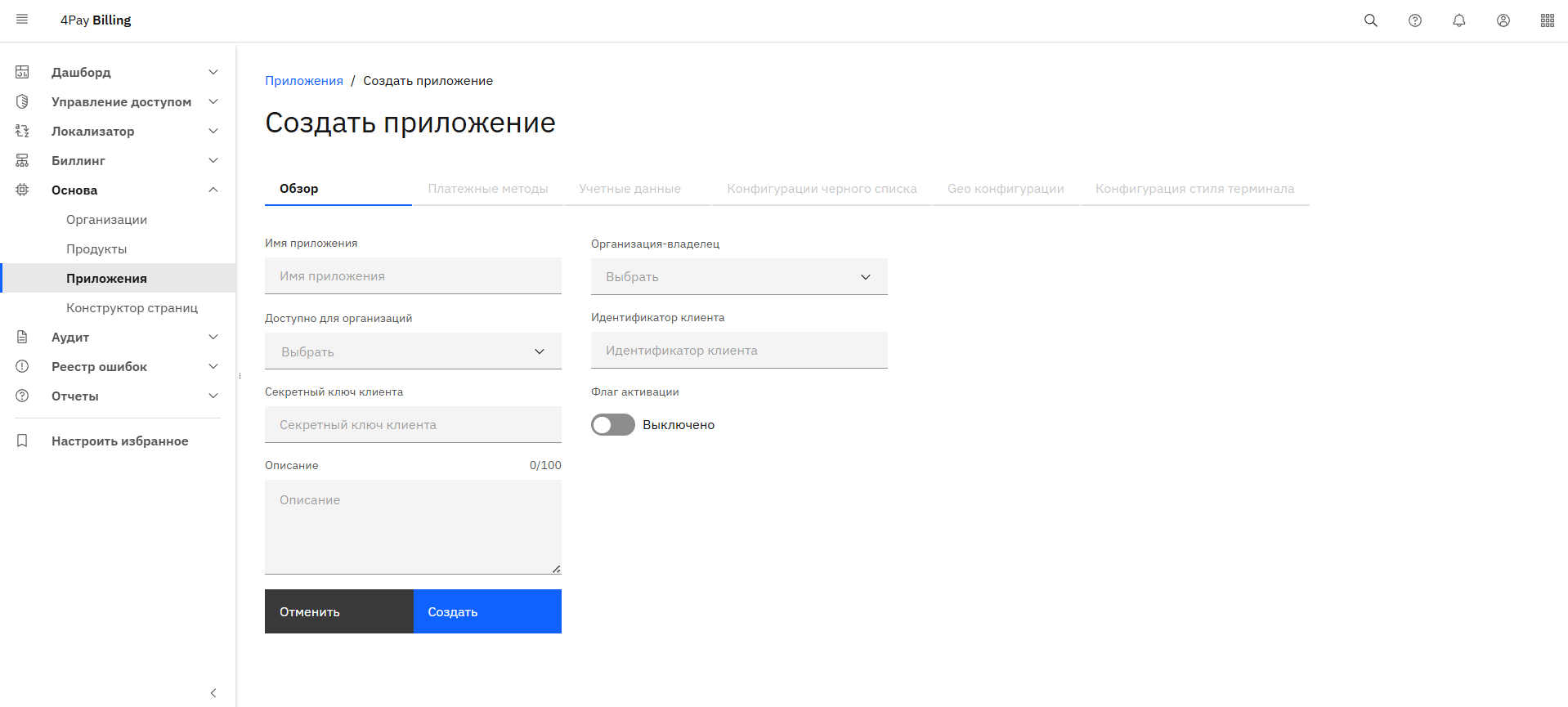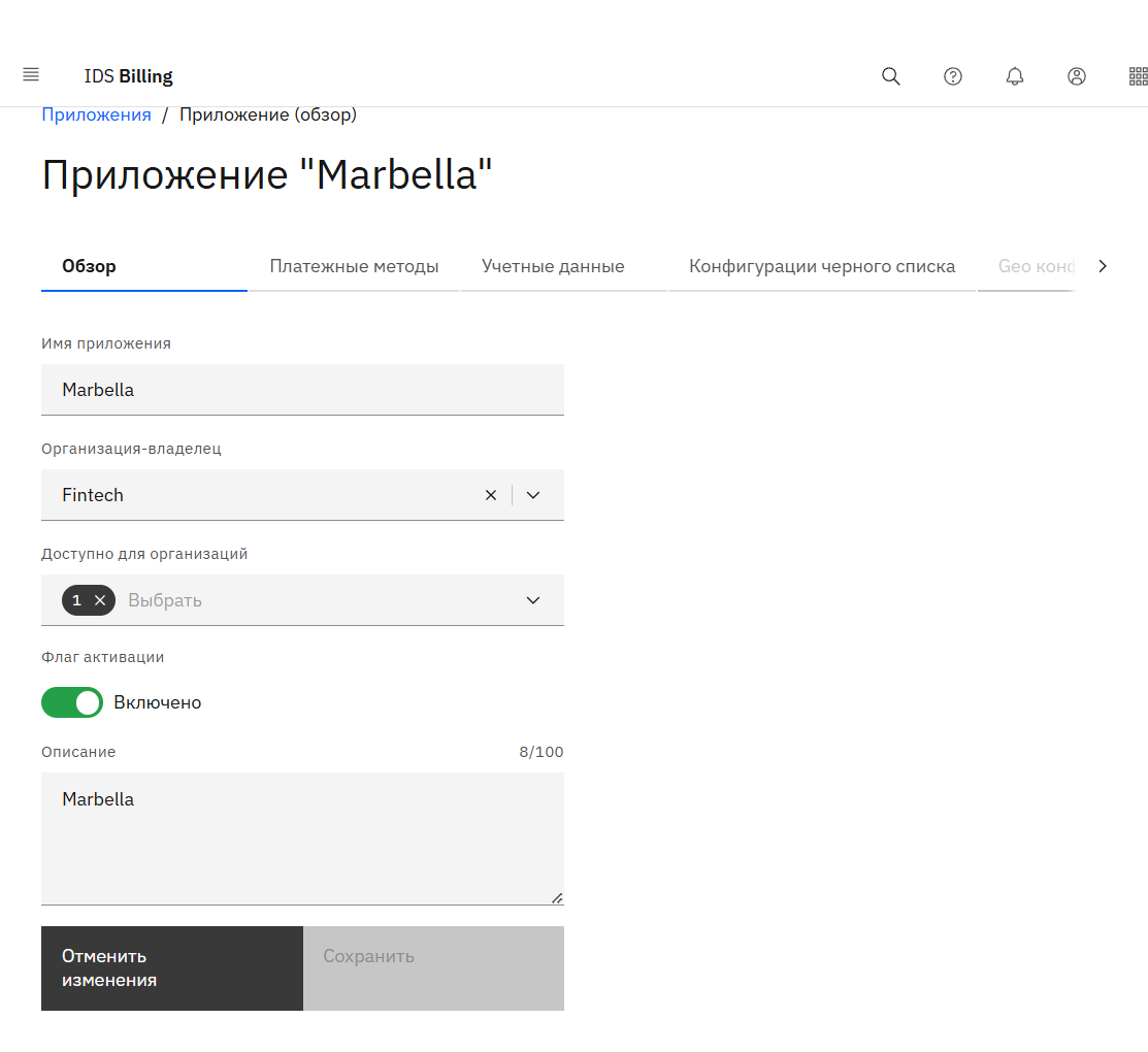 Редактировать приложение можно после нажатия на его название. В разделе редактирования 6 вкладок: “Обзор”, “Платежные методы”, “Учетные данные”, “Конфигурация черного списка”, “Geo конфигурации”, “Конфигурация стиля терминала”. Во вкладке Обзор можно изменить название и описание приложения, а также активировать/деактивировать его.