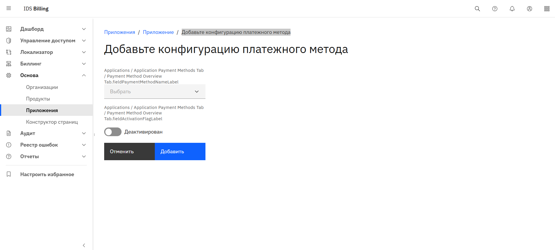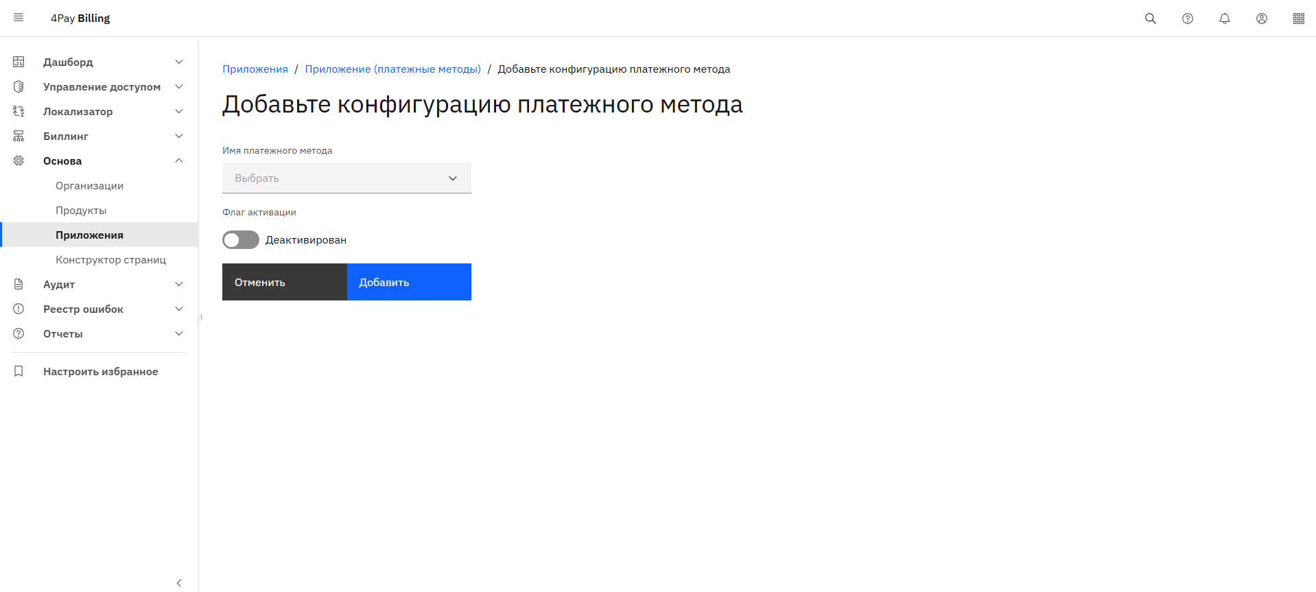 Вернемся во вкладку Платежные методы подраздела Приложения. Помимо редактирования готовых конфигураций платежного метода, здесь можно добавить новую конфигурацию.