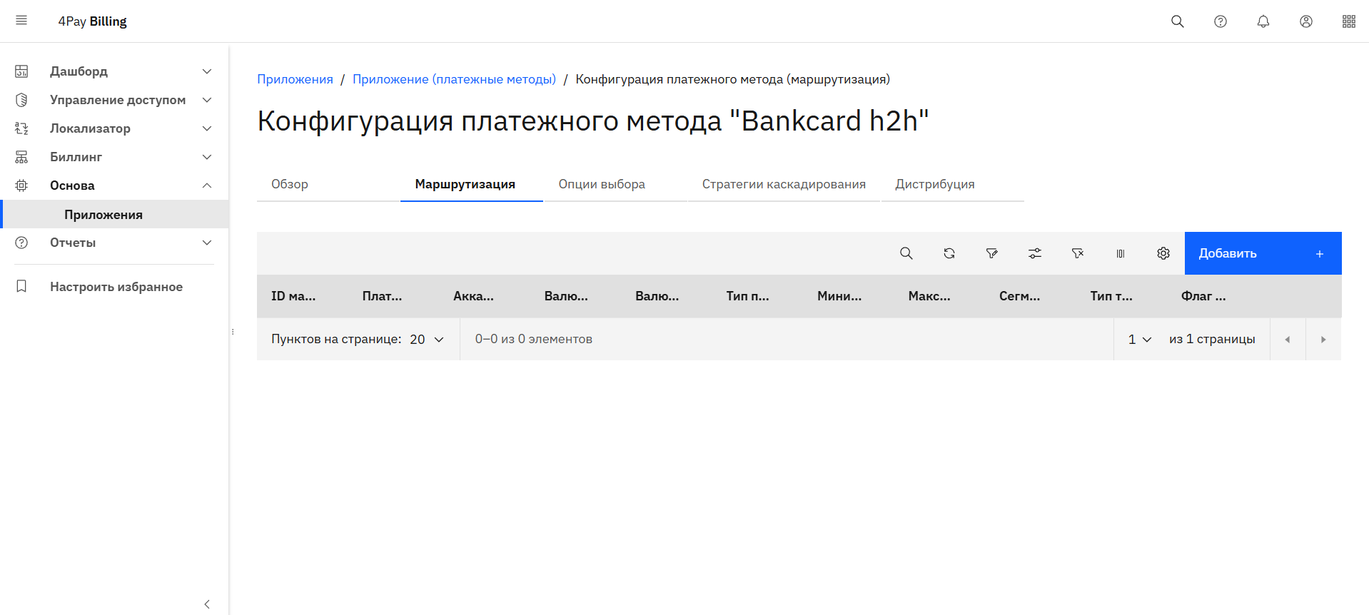 Во вкладке Маршрутизация в конфигурации платежного метода можно активировать/деактивировать конкретный маршрут способа оплаты (куда или откуда должны приходить деньги), а также посмотреть подробности уже настроенных маршрутов: ID маршрута платежного метода, платежную систему, аккаунт платежной системы, валютный счет, валюту, тип платежного метода, минимальное значение, максимальное значение.