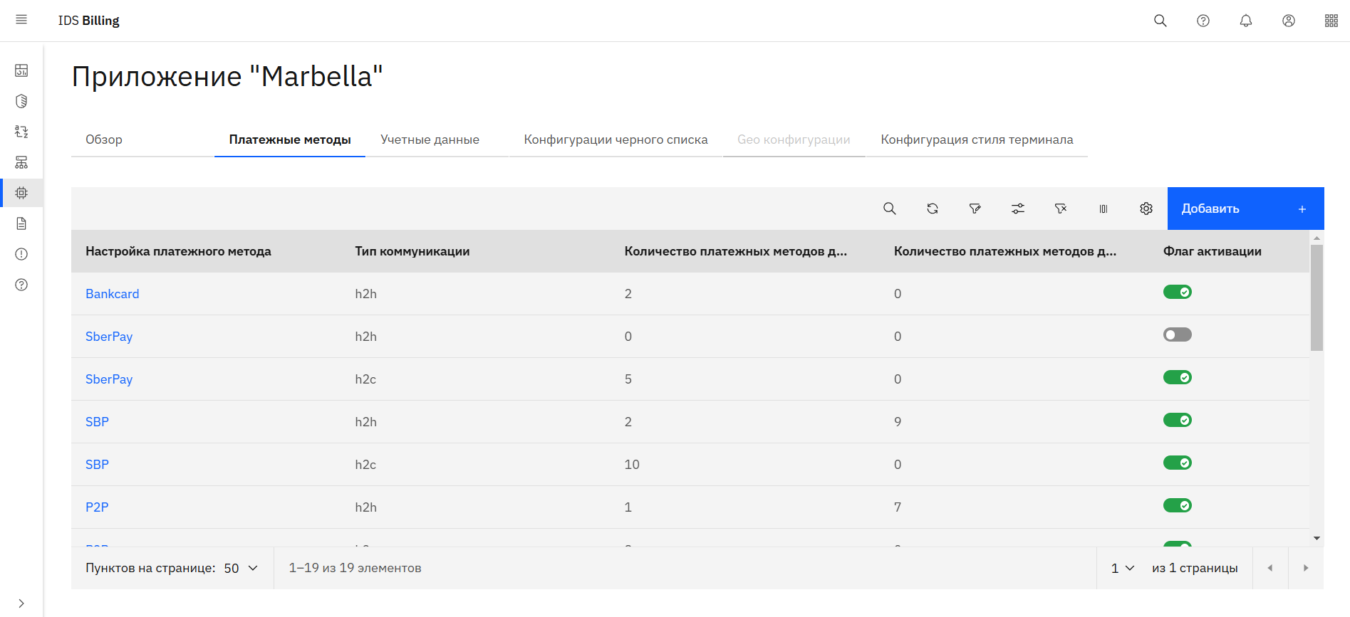 Во вкладке Платежные методы можно проверить тип коммуникации платежного метода, количество платежных методов для депозита и вывода, а также в этом разделе можно активировать/деактивировать любой платежный метод для выбранного приложения. По клику на название платежного метода в столбце Настройка платежного метода, можно перейти к его конфигурации.