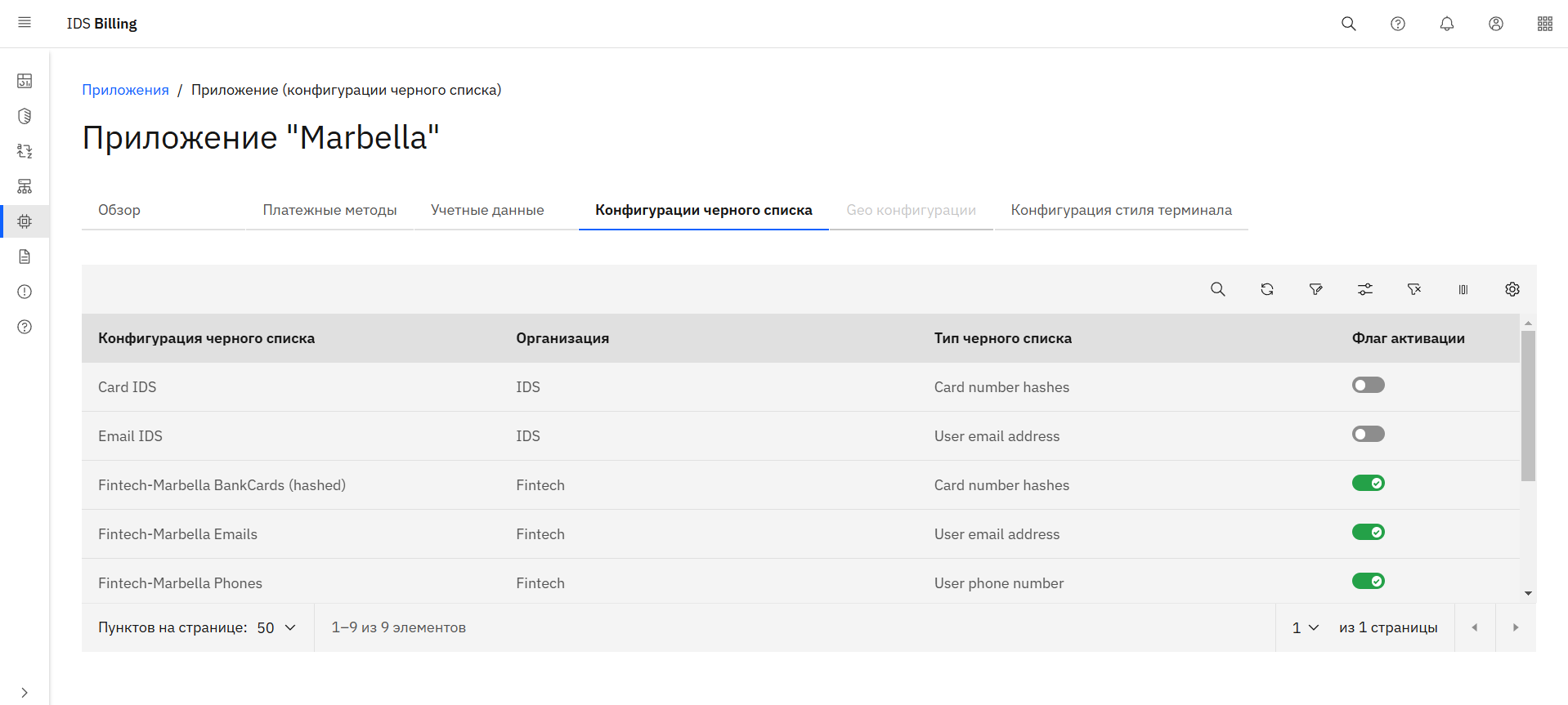 Во вкладке Конфигурации черного списка представлены доступные данному приложению черные списки. Здесь можно включать и отключать их.