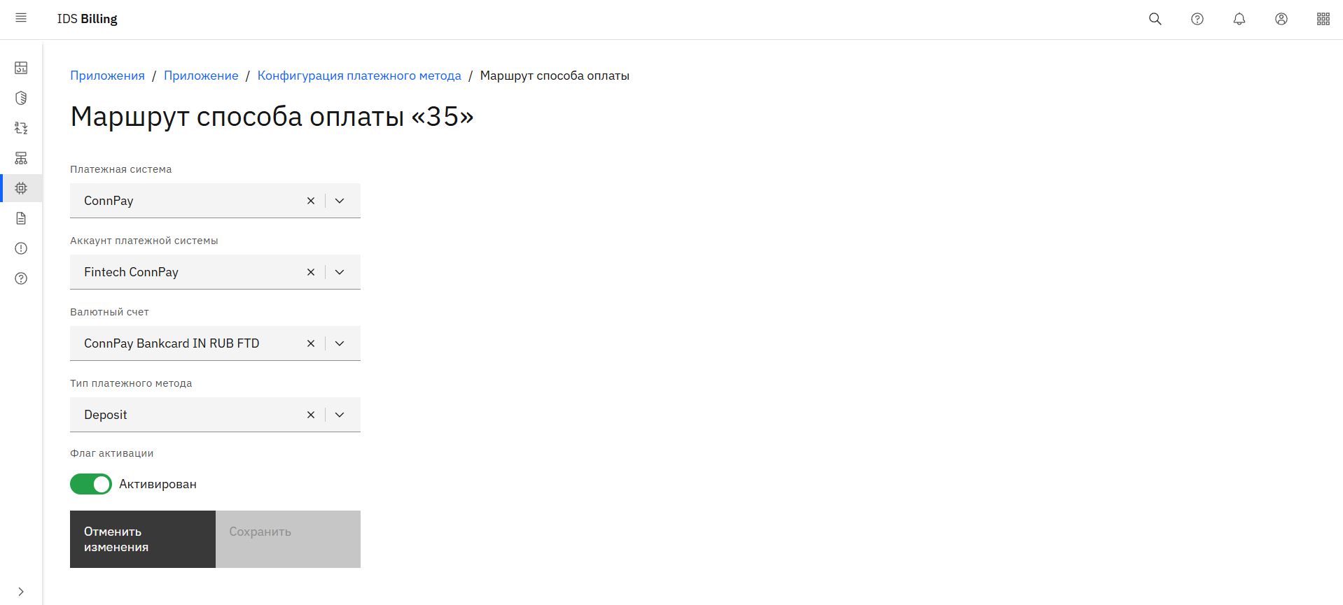 При редактировании маршрута, можно активировать/деактивировать этот маршрут способа оплаты.