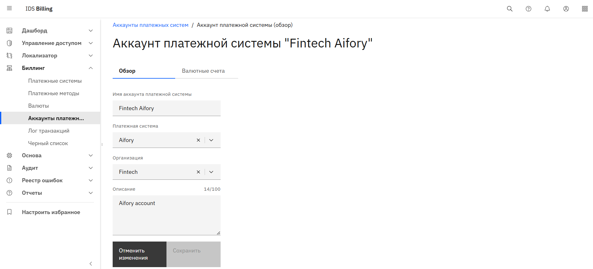 В разделе редактирования 2 вкладки: “Обзор”, “Валютные счета”. При создании нового аккаунта платежной системы отображаются такие же вкладки. При редактировании во вкладке Обзор можно изменить только имя аккаунта платежной системы и его описание.