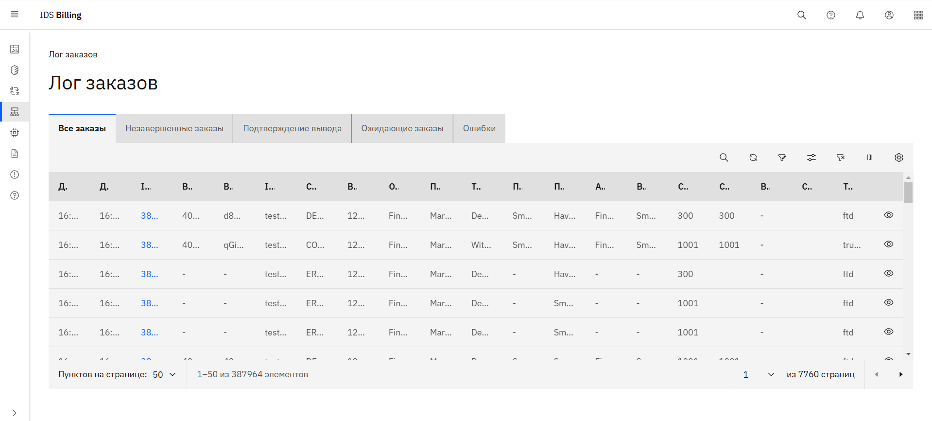 Для этого нужно перейти в продукт Биллинг, подраздел Лог заказов. В каждой строке отображается подробная информация о транзакции. Для удобства лучше включить контрастный цвет строк (стиль зебры) и горизонтальный скролл в настройках таблицы (иконка шестеренки в правом верхнем углу таблицы). Также для комфортного использования можно убрать ненужные столбцы. Это делается с помощью кнопки “Деактивация столба” (левее настроек).