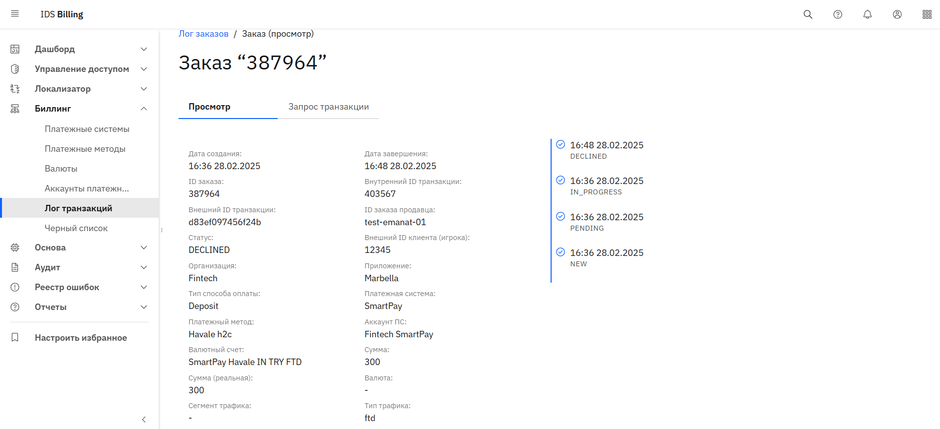 Во вкладке Лог заказов можно просмотреть все транзакции, совершенные клиентом. Если нажать на ID заказа, то откроется подробная информация об искомой транзакции в продукте Биллинг.
