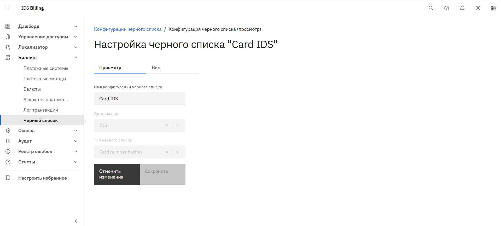 В разделе редактирования две вкладки: “Просмотр” и “Вид”. Во вкладке Просмотр можно изменить имя конфигурации черного списка.