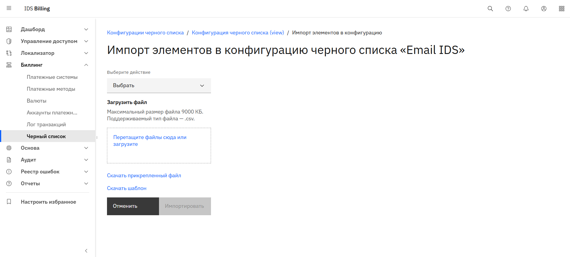 Импортировать черный список нужно в формате csv файла размером до 9000 КБ. Чтобы загрузить файл в правильном формате, можно скачать прикрепленный файл черного списка или шаблон внизу страницы. Также при импорте необходимо выбрать одно из действий: добавить элементы к уже имеющимся или перезаписать все элементы.
