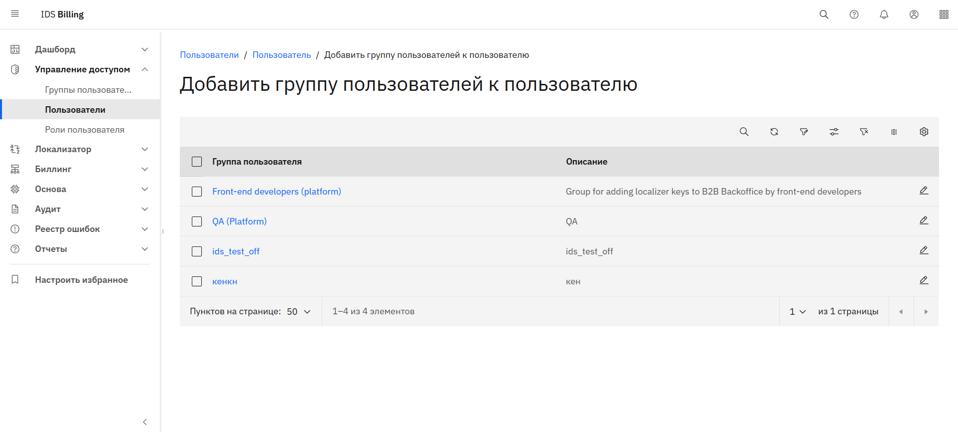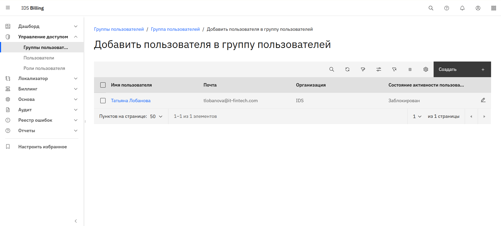 Нажатие на кнопку добавить перенаправляет на страницу со списком всех пользователей, которых можно добавить в группу. Добавить можно только пользователей своей организации, у которых еще нет группы, и тип их организации совпадает с типом организации группы пользователей.