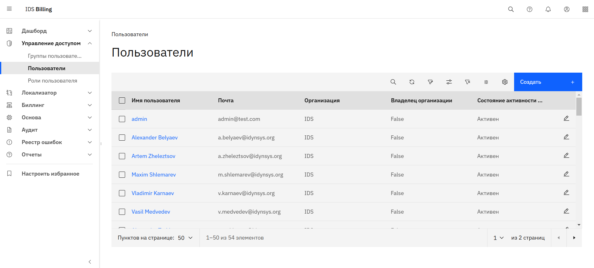 Здесь отображаются все пользователи организации. Также есть возможность их создания и редактирования.